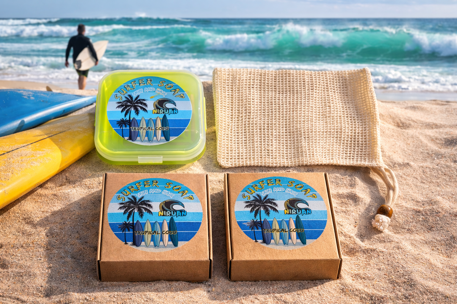 Everything you need for clean adventures. This special bundle includes 2 Nirvan Surfer Soaps, a travel-ready soap box, and a natural shower glove—perfect for surfers, travelers, and outdoor lovers who want simple, plastic-free hygiene on the go.